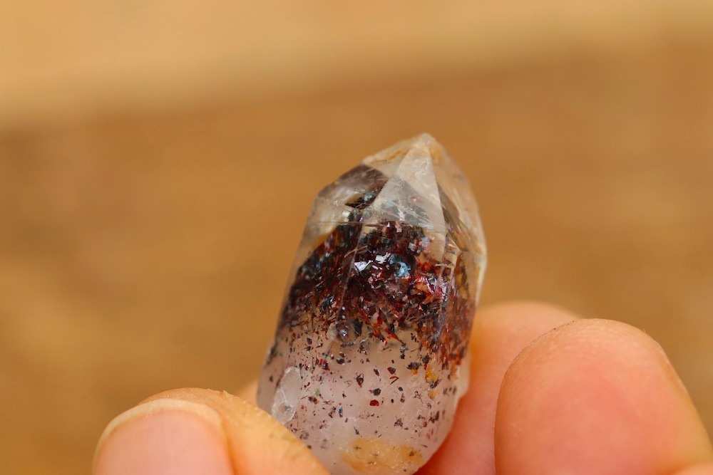 燃えるような印象的な赤色のレピドクロサイトが透明度の高い水晶の中からくっきりと覗けます。